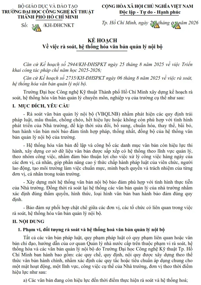 Kế hoạch rà soát, hệ thống hóa văn bản quản lý nội bộ của Trường Đại học Công nghệ Kỹ thuật TP. Hồ Chí Minh được ban hành nhằm kiểm tra, đánh giá toàn diện hệ thống văn bản hiện hành, kịp thời phát hiện các nội dung chưa phù hợp, chồng chéo, hết hiệu lực để sửa đổi, bổ sung, thay thế hoặc ban hành mới.